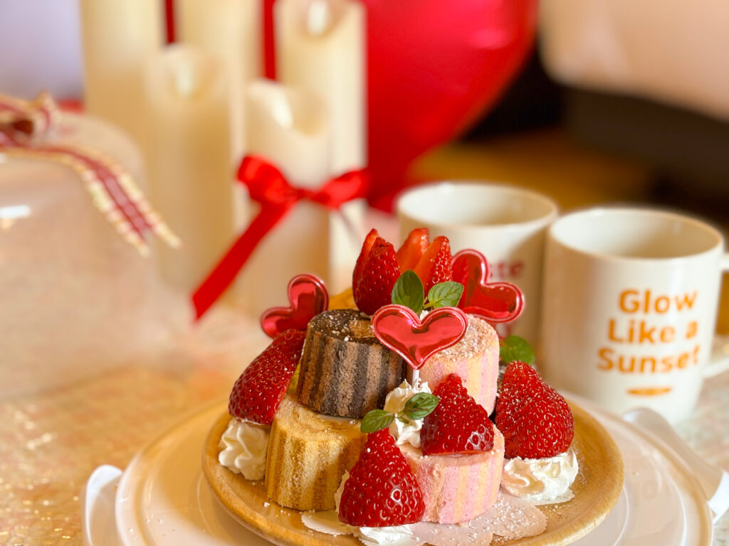 赤やピンクを基調とした、大人可愛いバルーンやガーランドで客室を特別ドレスアップ。ドアを開けた瞬間に広がる非日常空間は、SNS映えも抜群です。プライベートなフォトスタジオのような空間で、記念撮影をお楽しみください。