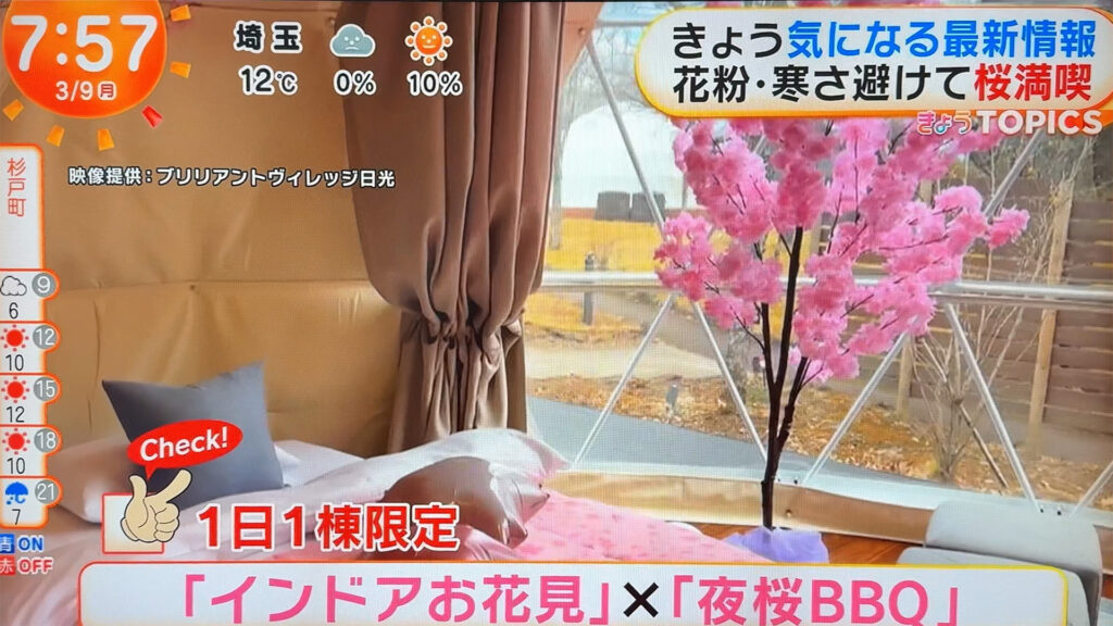 今回取り上げていただいたのは、本日より待望のご宿泊がスタートした「お花見グランピングプラン」です。