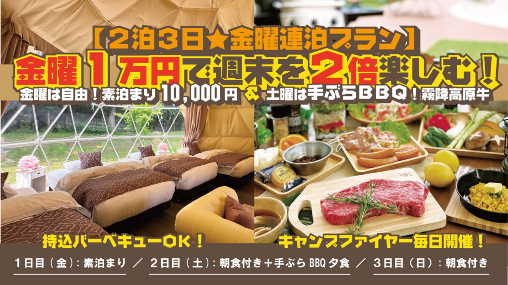 | プラン名 | 【2泊3日★金曜連泊プラン】初日は素泊まり1万円!自由な夜×土曜手ぶらBBQ<1泊2食付> |